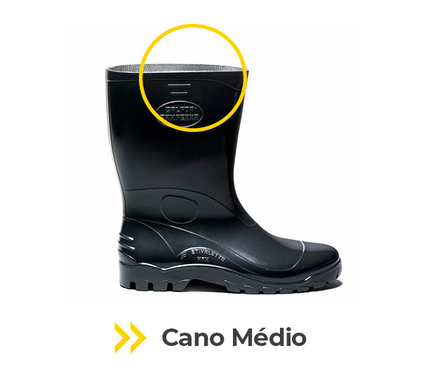 A bota é produzida em peça única (cano e sola), com tecnologia de injeção dupla, que assegura resistência estrutural e maior vida útil.