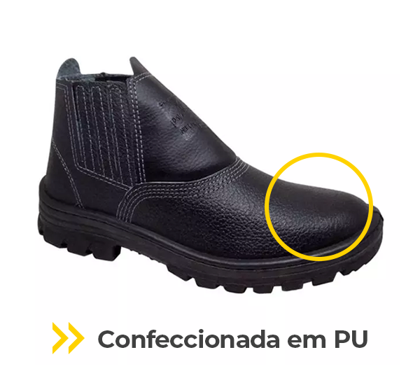 A Botina Cartom com elástico em PU é a solução perfeita para quem busca um calçado de segurança acessível e confortável. Calçado ocupacional modelo botina, tem fechamento em elástico confeccionado em couro curtido ao cromo. Palmilha de montagem em não tecido, montada sistema strobel, solado em poliuretano monodensidade. Possui resistência ao escorregamento em piso de cerâmica contaminado com lauril sulfato de sódio (detergente) (SRA).