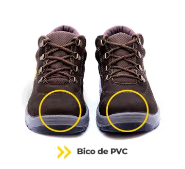 Confeccionada em couro nobuck na cor café, possui bico de PVC, solado em PU bidensidade e forração interna acolchoada, garantindo proteção e bem-estar ao longo do dia.