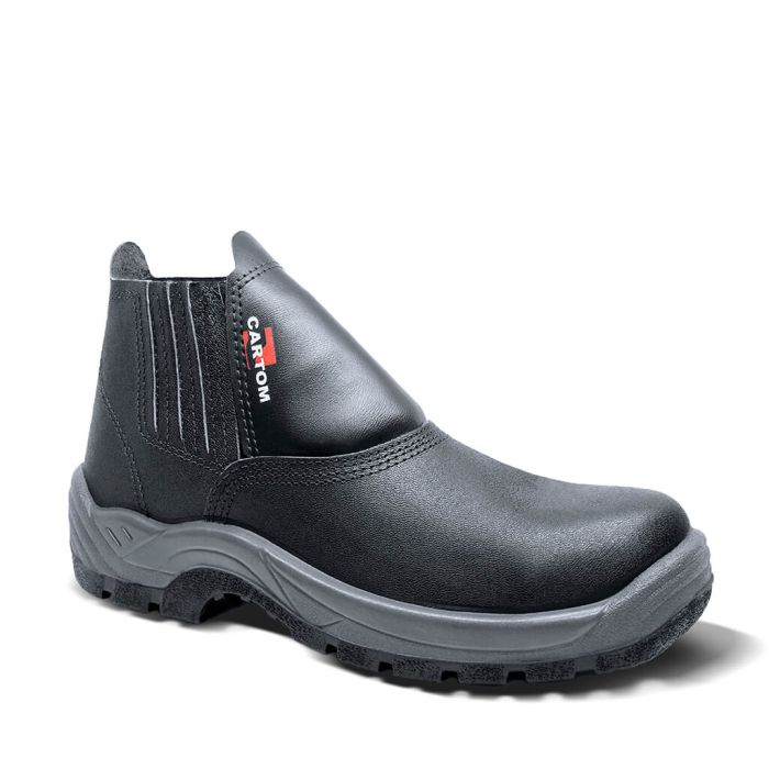 O Calçado de Segurança tipo Botina ou Bota Cartom modelo TP085LSCPT com elástico e bico/biqueira de composite é fabricada em couro vaqueta liso, seu fechamento (amarração) é em elástico e possui palmilha de montagem em não tecido, fixada pelo sistema strobel com solado em poliuretano bidensidade injetado direto ao cabedal (muito mais resistência).