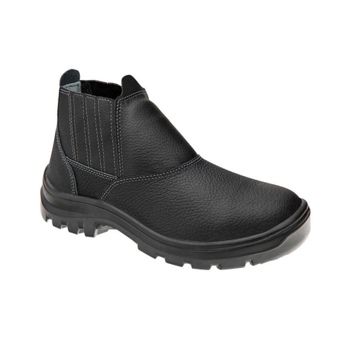 Bota de segurança confeccionada em couro com biqueira de polipropileno, fechamento em elástico nas laterais, palmilha de montagem em EVA, solado em PU bidensidade bicolor com sistema de absorção de impacto, injetado diretamente no cabedal.