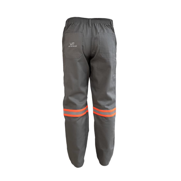 - Cor: Cinza claro com faixa refletiva laranja abaixo do joelho