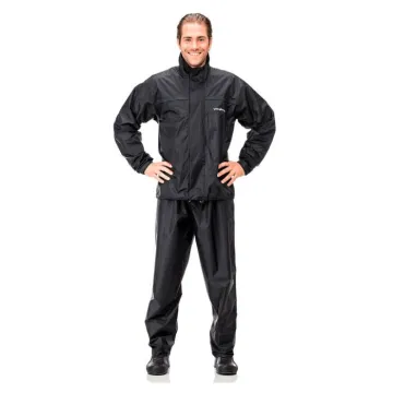 Conjunto jaqueta mais calça de chuva em nylon com gola. Jaqueta com bolso interno, cintura ajustada com elástico regulador, punhos com elástico e velcro, fechamento frontal com zíper e velcro. Refletivo nas costas e no velcro da calça.