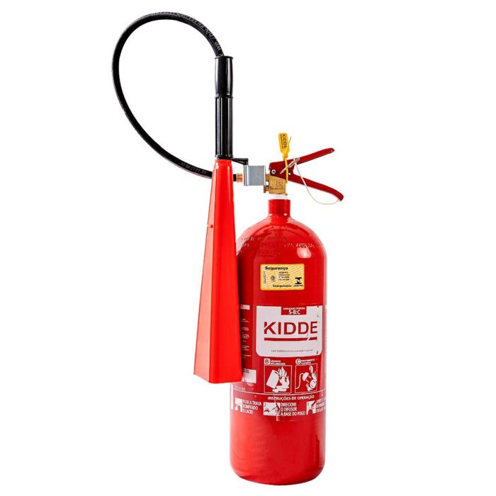 O extintor portátil possui carga de 4 kg de gás carbônico (CO₂), sendo indicado para combate a incêndios das classes B e C.