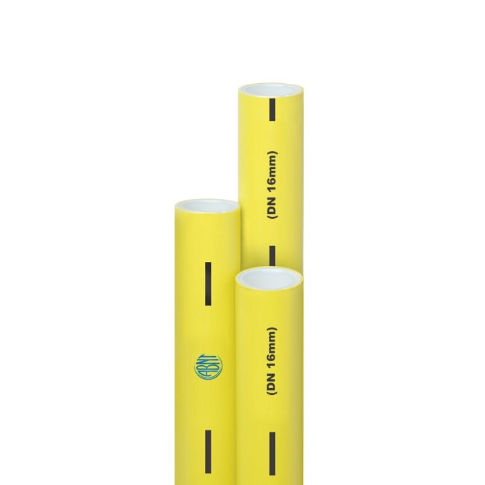 Tubo PEX multicamadas amarelo para gás 16mm, 3/8 polegadas de 4 metros, com capacidade de pressão suportável de 5 bar. O sistema de multicamada flexível é uma linha diferenciada de tubos e conexões para gás (GN e GLP) e água quente e fria.